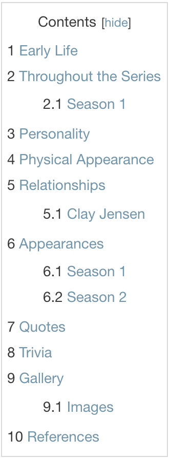 - Appearances — Chronological list of the Character's 13 Reasons Why episode appearances in a bulleted list. (If the list is too long, consider using the Col template.)
