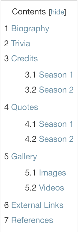 - Throughout the Series — Character's detailed history throughout the series, written in present tense and in chronological order of the episodes. This section should contain season subheadings and a tabber to separate the seasons.